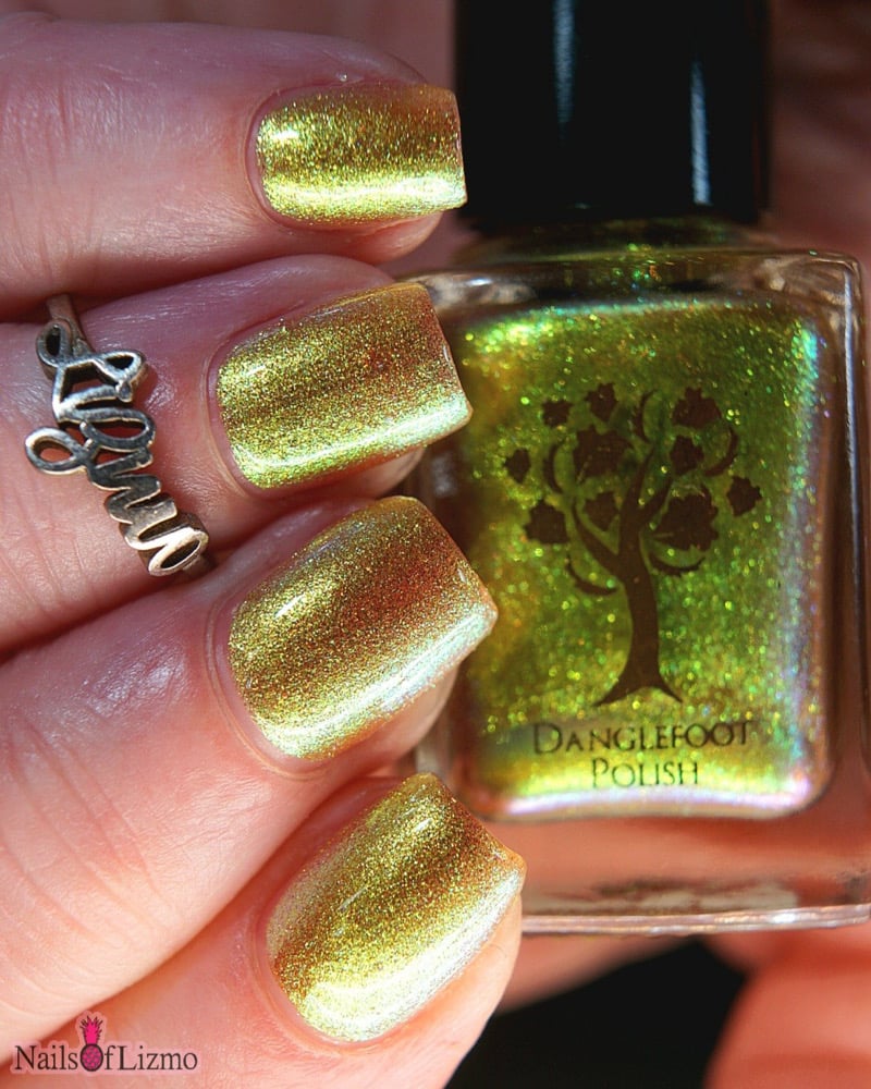 Gold/olive green chrome in a pale orange base (the shimmer mostly overpours the base colour) inspired by the human torch from Fantastic Four.