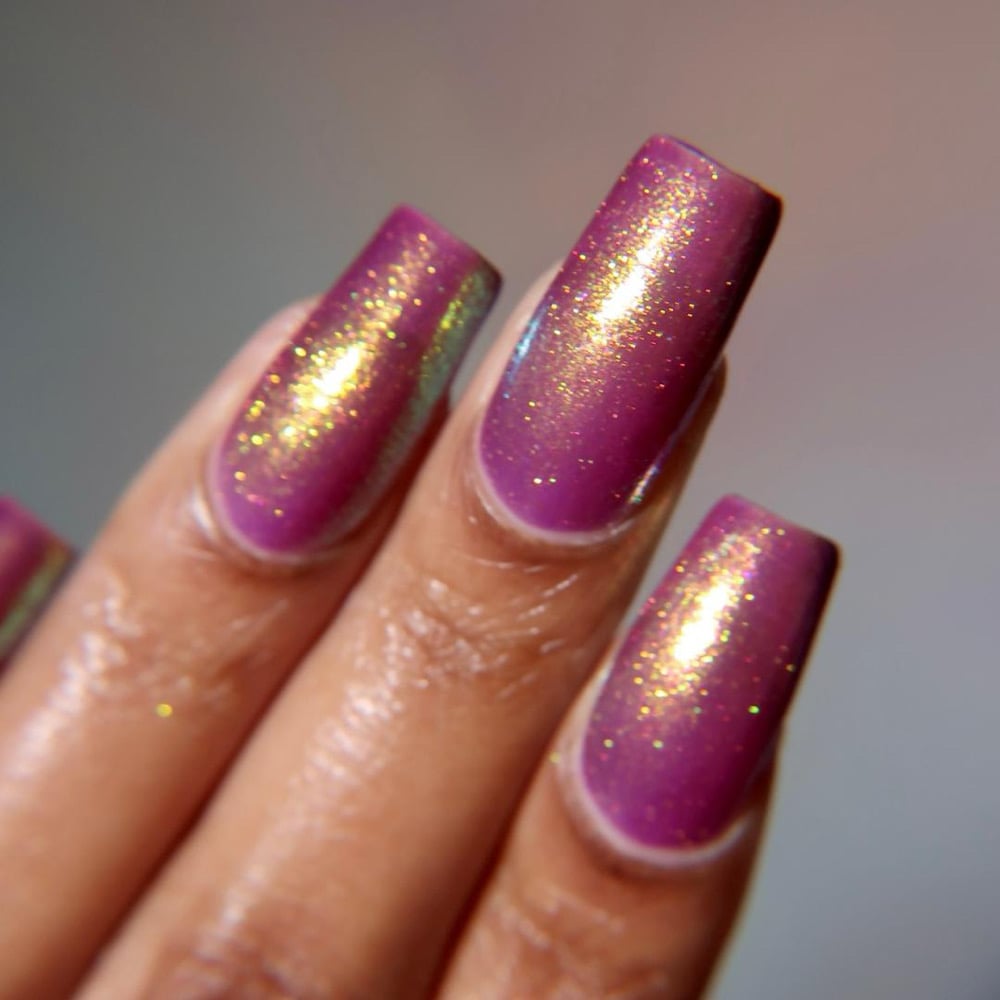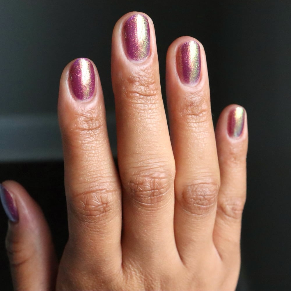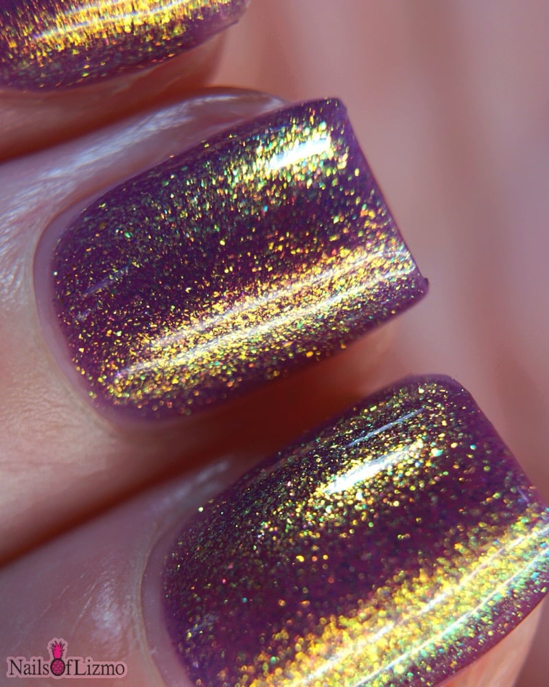 Dusky mauve base with strong gold/green/blue/purple shimmer inspired by Thanos and the Avengers