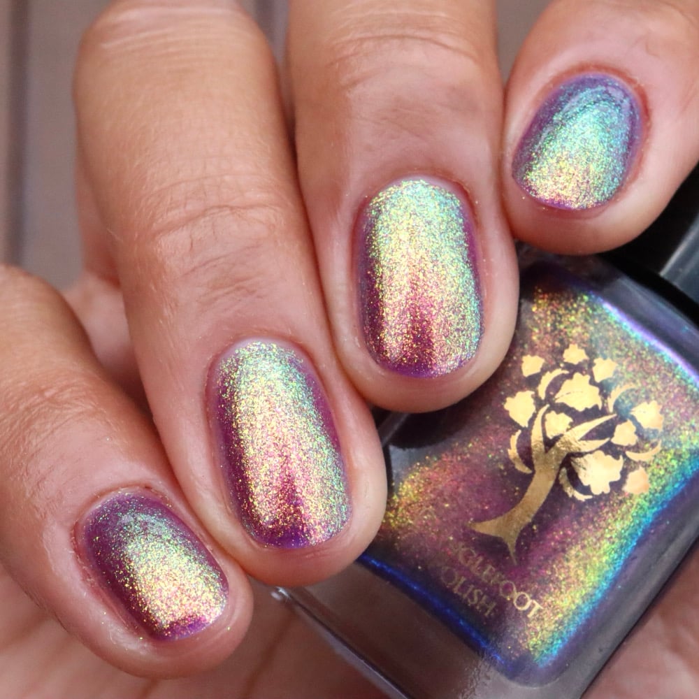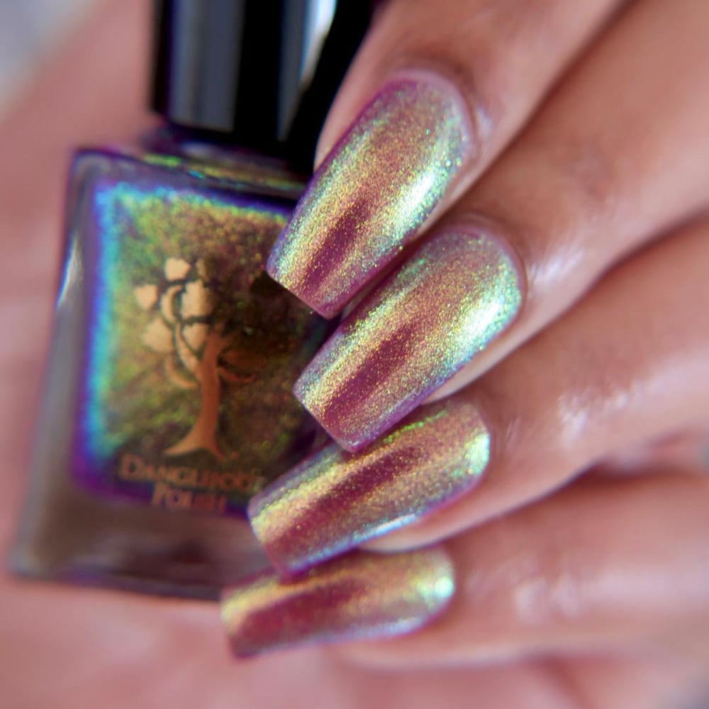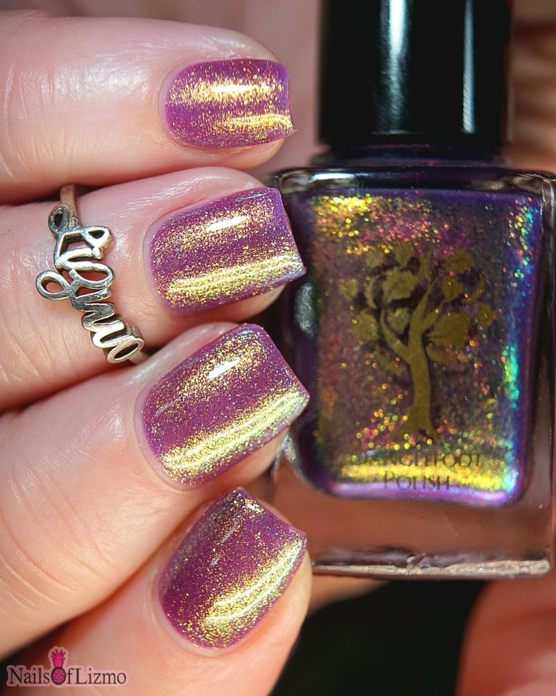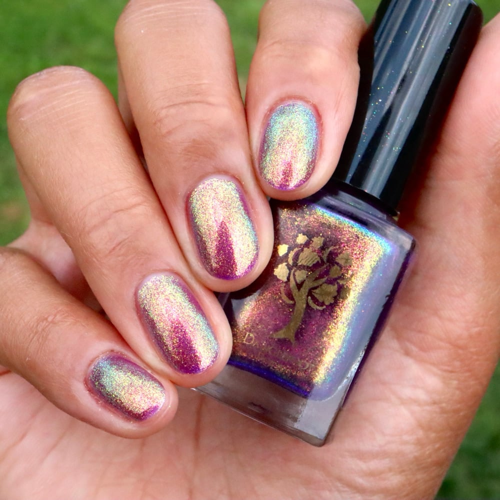 Dusky mauve base with strong gold/green/blue/purple shimmer inspired by Thanos and the Avengers