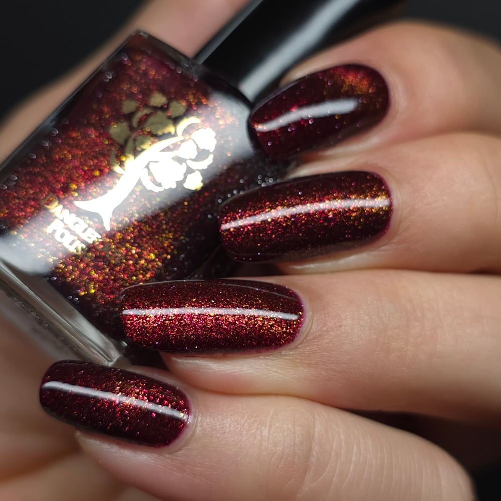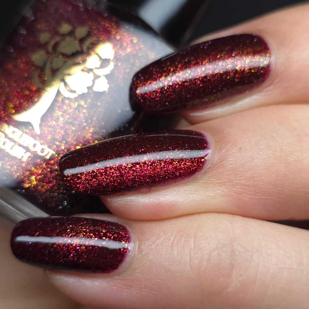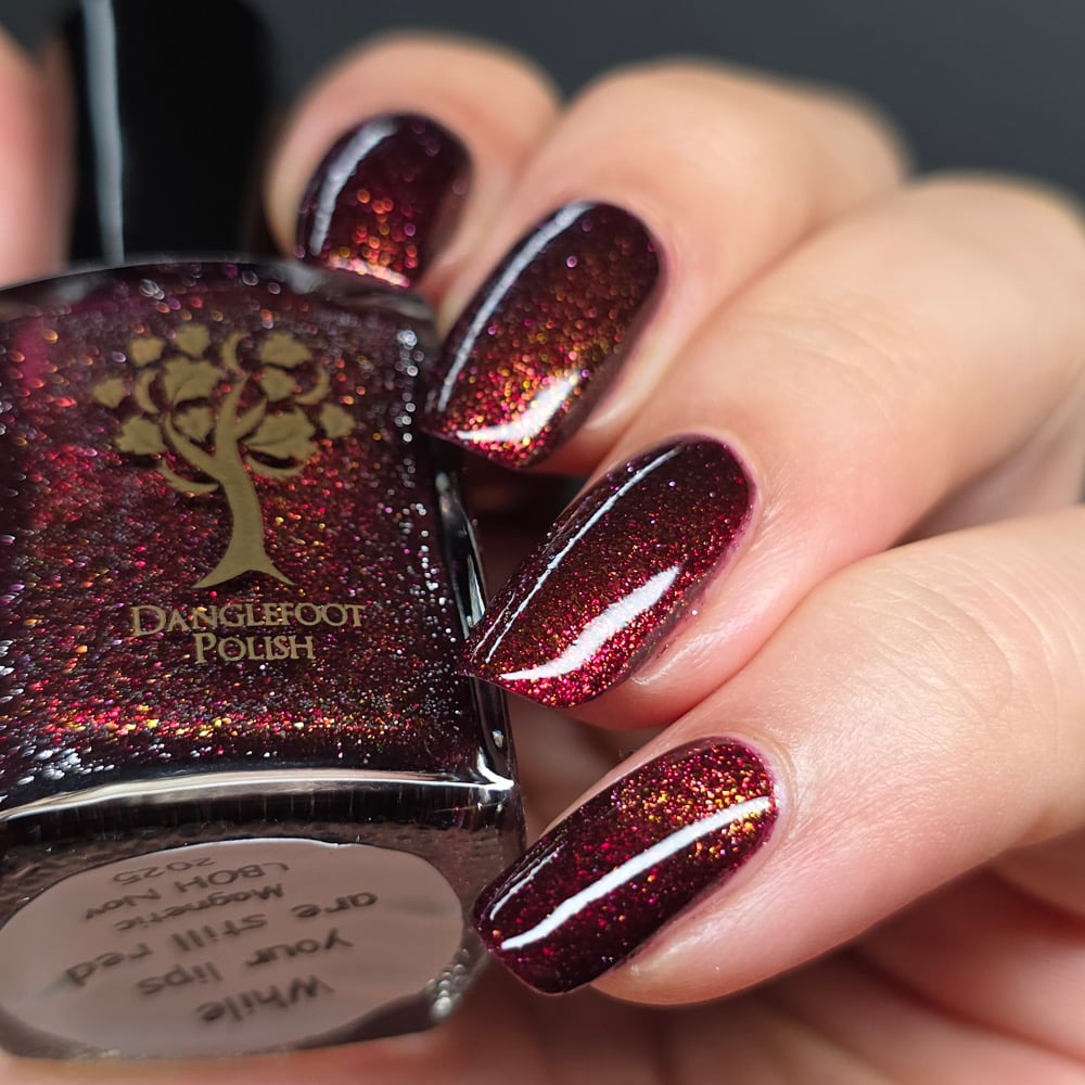 While your lips are still red - Blackened red base with orange/red/gold magnetic flakes.These are not as reactive as finer magnetic pigment and leave a broader cat eye effect. They work very well as a velvet nail effect.