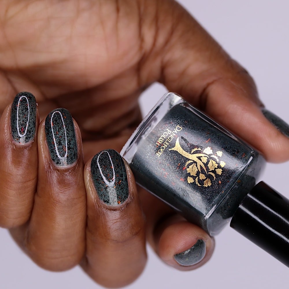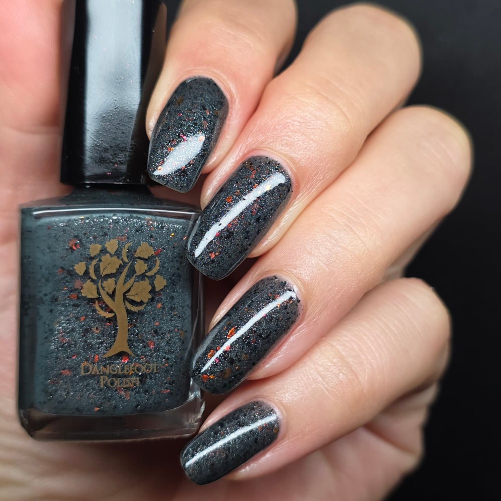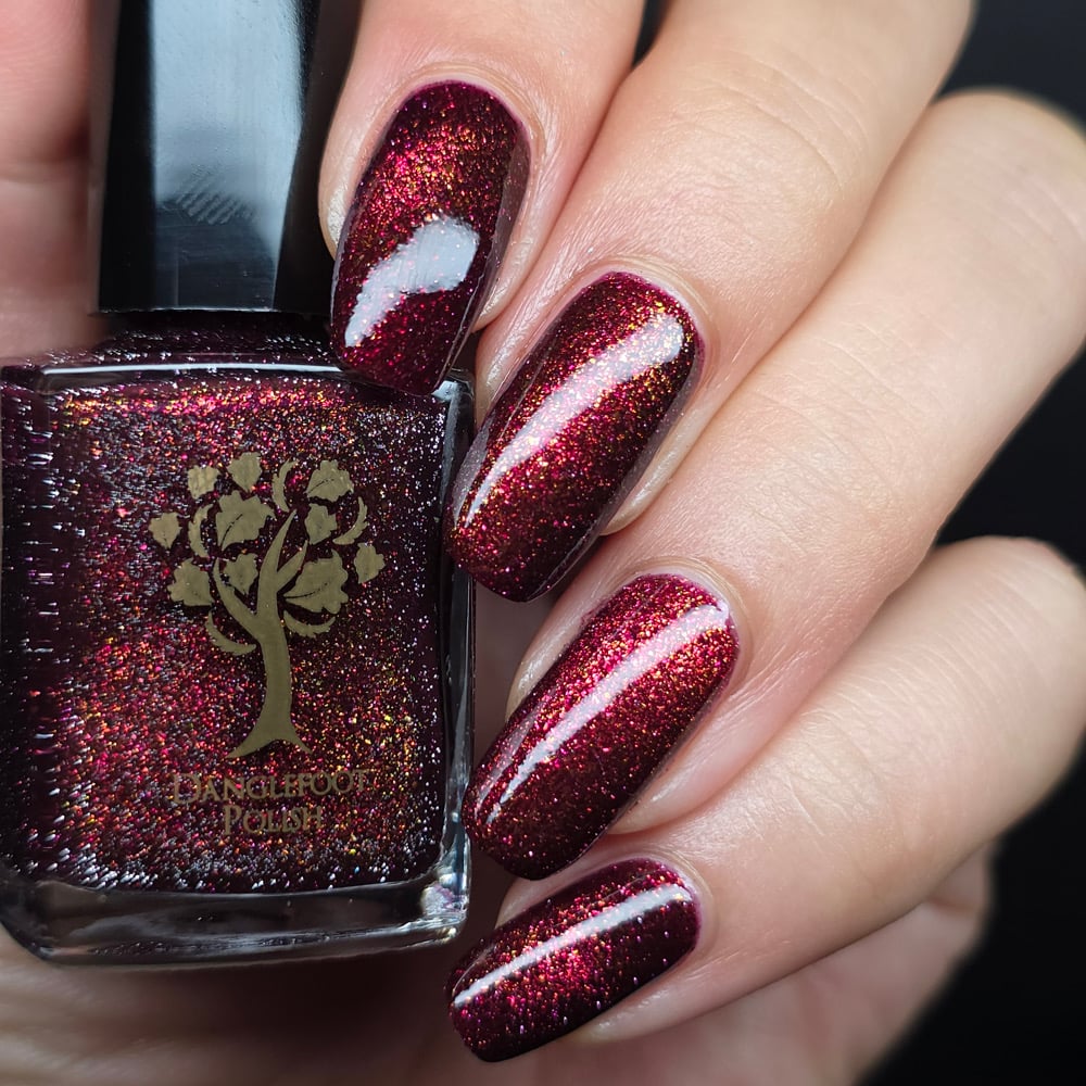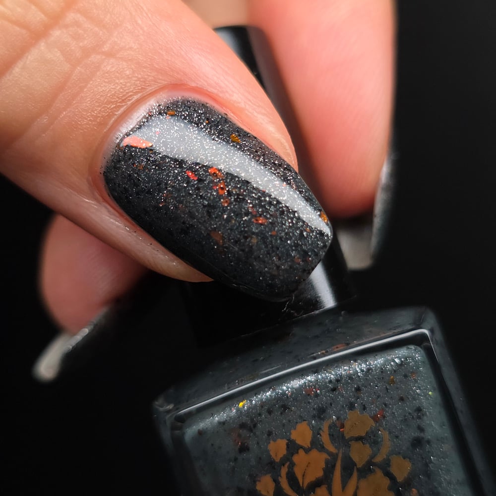 While your lips are still red - Blackened red base with orange/red/gold magnetic flakes.These are not as reactive as finer magnetic pigment and leave a broader cat eye effect. They work very well as a velvet nail effect.
