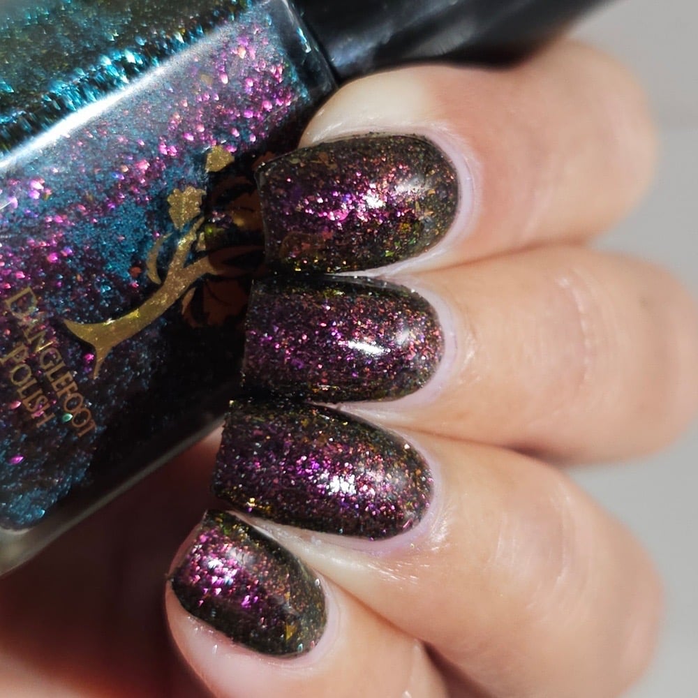 A jelly black base with a purple/red/orange/green flakes and blue reflective glitter and